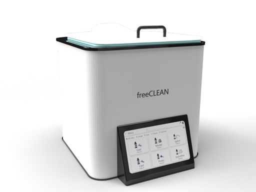 The new ”cleaning device“ freeCLEAN represents another building block for the optimized and controlled manufacturing process of medical devices by generative fabrication. Unlike conventional ultrasonic baths the  freeCLEAN generates a vortex of the cleaning agent. As a result, microcracks in the component surfaces are significantly reduced, thus further increasing the part quality in terms of surface finish, appearance and mechanics of your dental objects. A selection of different cleaning programs assists you in perfectly matching the cleaning program to the selected material class and choice of cleaning agent. The cleaning container can be easily removed and changed in order to simplify the manufacturing processes in your lab. Changing the cleaning liquid can be done within seconds in a convenient way.